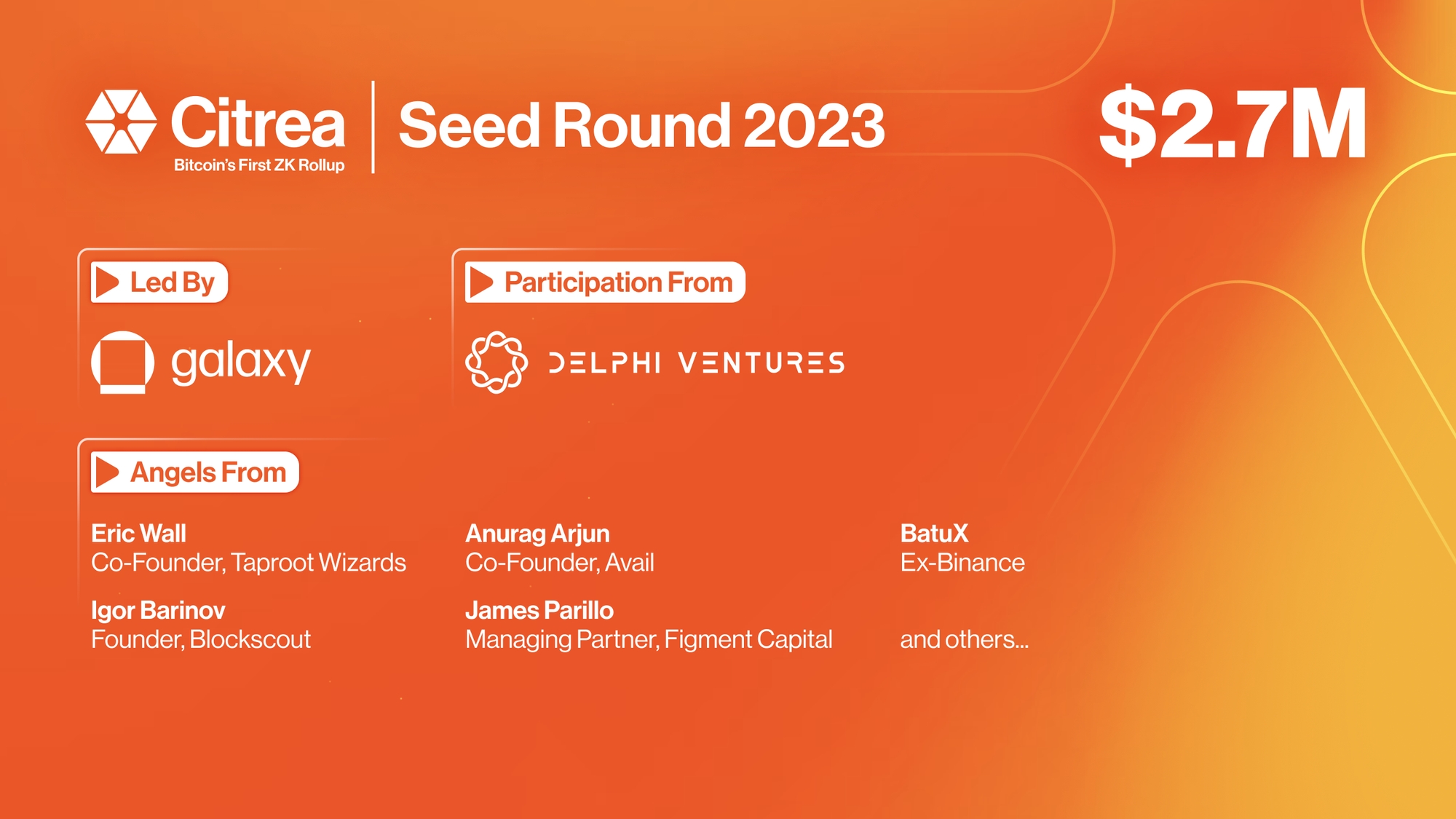 We’re proud to announce that Chainway Labs, the company building Citrea, has raised $2.7 million in seed funding to develop Bitcoin’s First ZK Rollup. The round closed in 2023 and was led by Galaxy, with participation from investors including Delphi Ventures, Eric Wall, Anurag Arjun, BatuX, Igor Barinov, and James Parillo, among others.
