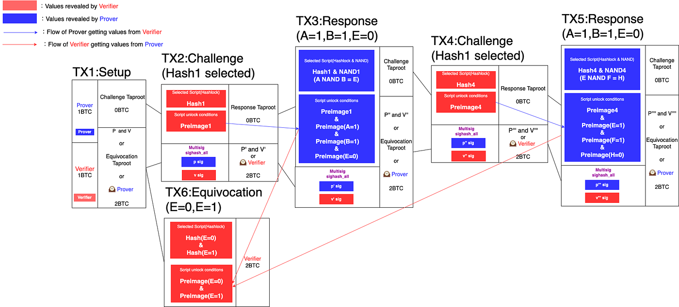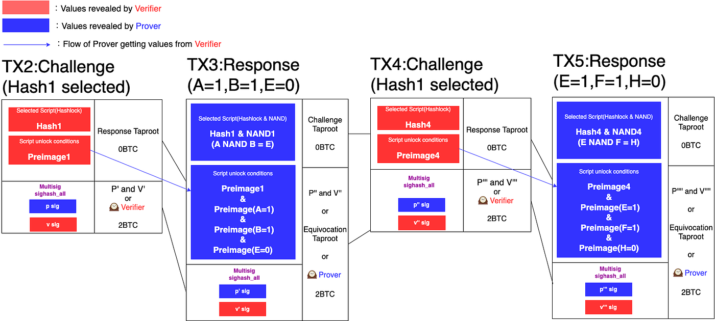 4.Challenge & Response The Verifier selects a gate of his choice by exposing the unlock conditions of the Challenge Taptree, and the Prover opens the gate by exposing the unlock conditions of the Response Taptree. Ideally, this interaction is performed off-chain.(It can also be executed on-chain although) Both parties repeat this process several times, until either an inconsistency is revealed, or the Verifier exhausted the space of possible challenges.